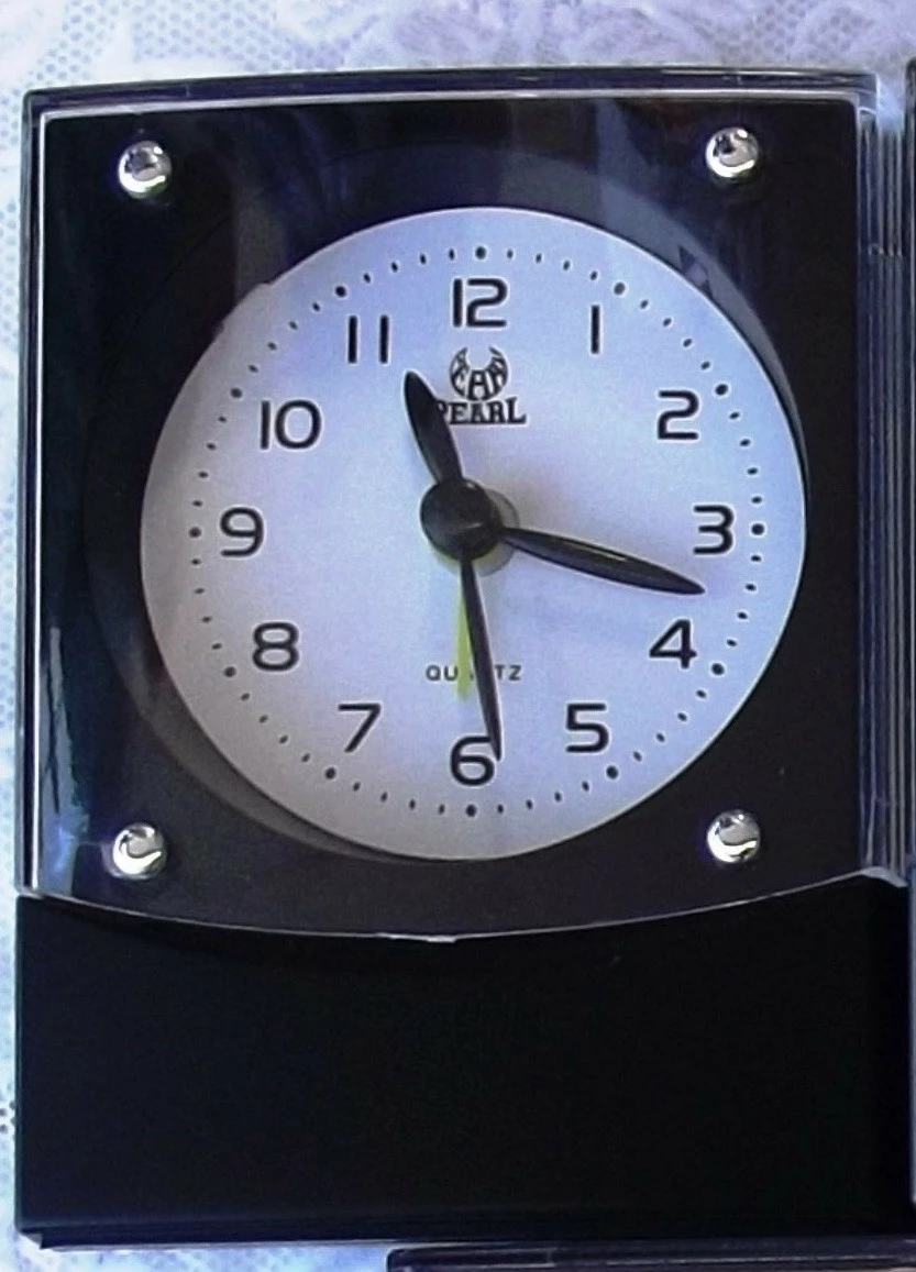 Часы выполнены в форме прямоугольника из пластика черного цвета. Циферблат белый . Есть подсветка / для просмотра времени ночью /, кнопка находится c тыльной стороны. Продолжительность работы сигнала будильника до 30 минут, отключается сзади.Так же в часах имеется функция повтора звонка через 5 мин . Для этого во время работы будильника , необходимо нажать на клавишу подсветки , звонок отключится , но через 5 мин опять сработает . Эту процедуру можно повторять многократно . Механизм кварцевый,на одной пальчиковой батарейке /элемент питания А А /.